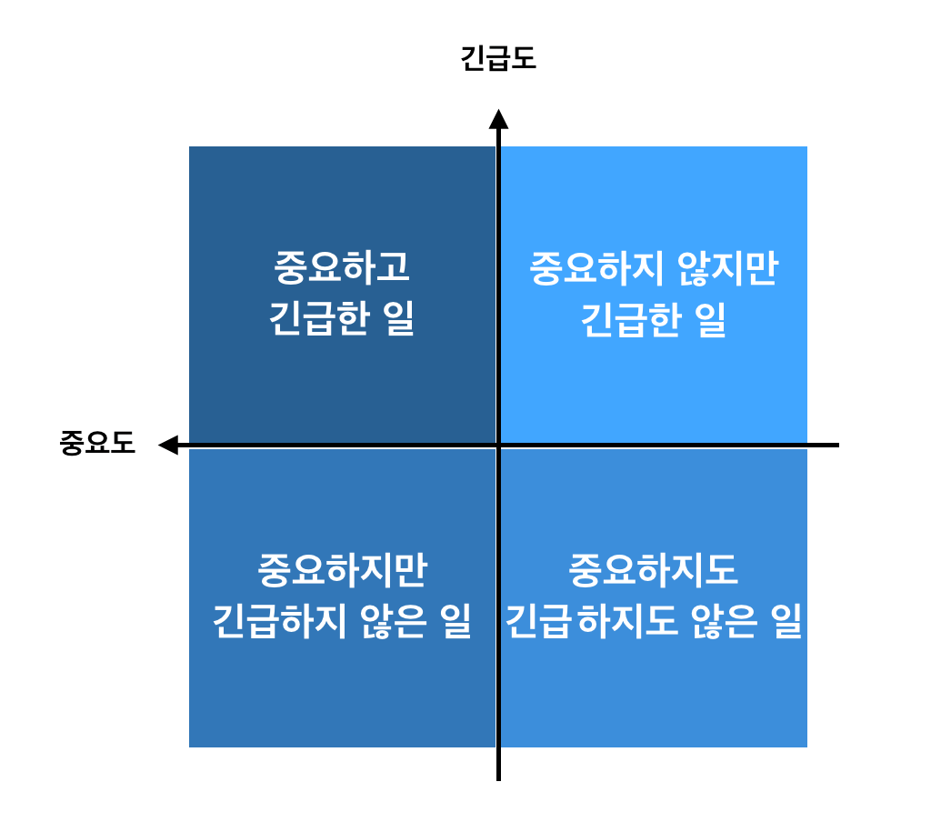 - 위의 네 가지 일의 중요도를 매겨보자, 당연히 중요하고 긴급한 일이 1순위가 될 것이고, 중요하지도 긴급하지도 않은 일은 4순위가 될 것이다. 그럼 중요하지 않지만 긴급한 일과 중요하지만 긴급하지 않은 일 중 어느 것의 우선 순위를 먼저 두어야 할까?