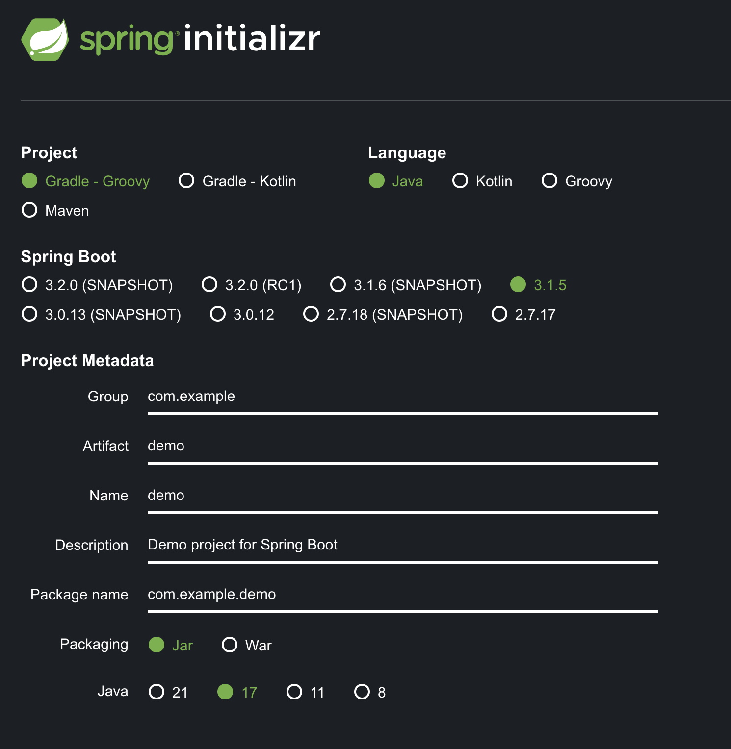 아마 많은 분들이 start.spring.io에서 스프링 프로젝트를 만들 것이라고 생각된다. 나 역시 마찬가지로 해당 서비스를 이용했다. Spring Boot 버전을 3.1.5로 세팅하고, 이것저것 메타 데이터를 설정한 뒤, 여러 의존성을 추가하고 자바 버전을 11로 설정한 뒤 프로젝트를 생성했다.