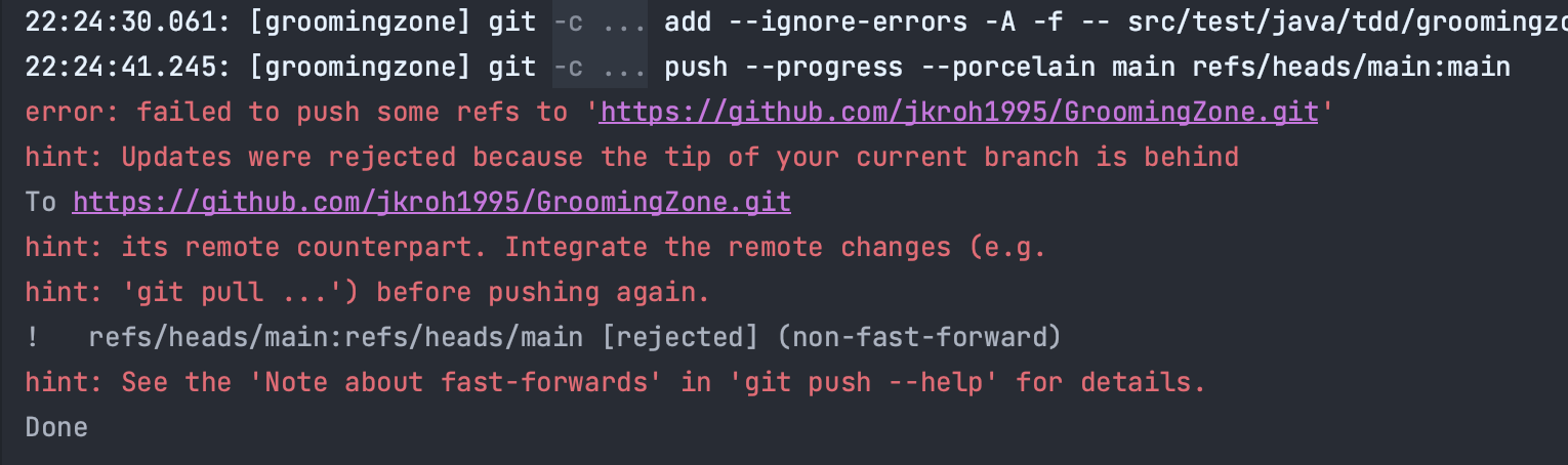 평화롭게 TDD 프로젝트를 진행하던 어느 날... 갑자기 git push가 거절당했다.
