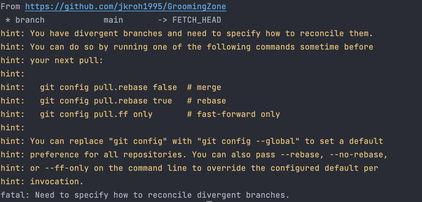 지져스, pull이 제대로 되지 않았다. 원격 저장소에는 따로 커밋, 로컬에서도 따로 커밋이 진행되다 보니, 원격 브랜치와 로컬 브랜치에 차이가 발생했고 여기서 문제가 발생한 것 같았다. 적절한 pull 전략을 선택해 두 브랜치를 아주 조화롭게 만들어줘야했다. 아니면 아예 현재 브랜치를 로컬에 맞게 바꾸거나.