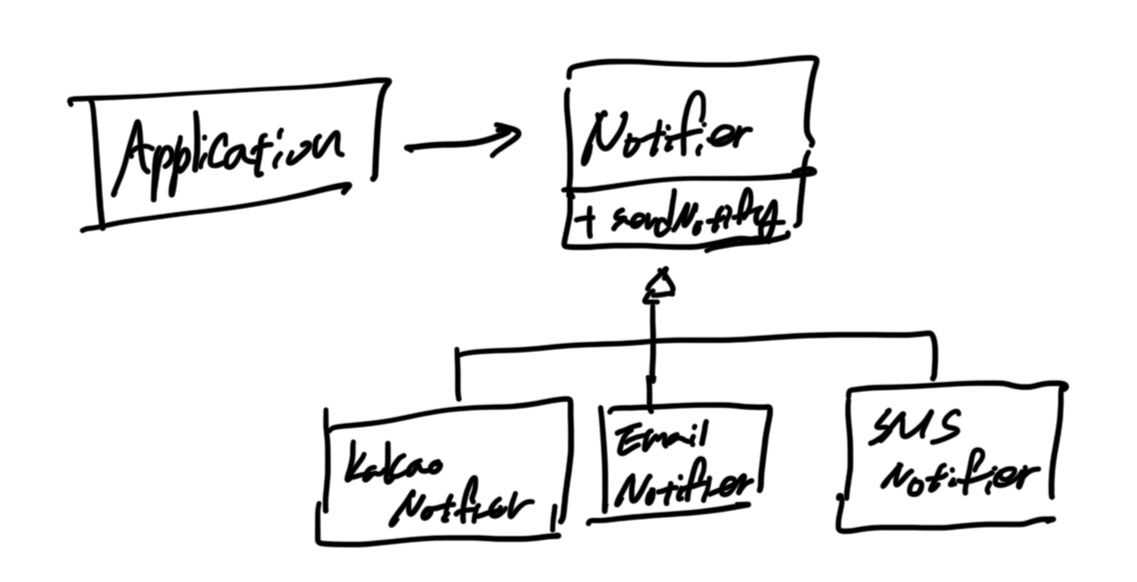- 이 때, KakaoNotifier, EmailNotifier, SMSNotifier를 Notifier의 하위 객체로 설정하고 프로그램에서는 Notifier를 그대로 사용하게 해도 애플리케이션이 돌아가는 데에는 문제가 없다.