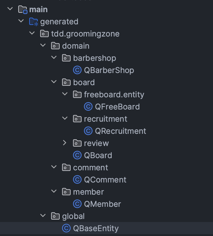 Querydsl을 사용하기 위해서는 build.gradle에 의존성을 추가함은 물론 여러 설정도 거쳐야 한다. 특히 Querydsl의 버전이 스프링부트의 버전 및 자바 버전과 밀접한 연관이 있다고 하여 이 부분은 링크를 참조해 설정했다. 글 말미에 참조한 글들의 링크를 전부 걸어둘 예정이다. 위의 설정을 적용하고 프로젝트를 재빌드하면 아래와 같은 디렉토리에 이름 앞에 Q가 붙은 Q클래스들이 생긴다.
