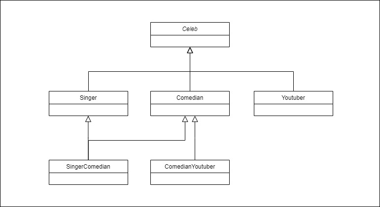 Celeb이라는 클래스를 상속받은 Singer, Comedian, Youtuber 클래스가 있다고 하자. 그런데 시간이 지나면서, 가수면서 코미디언인 사람이 새로 등장할 수도 있고, 코미디언이면서 유튜버인 사람이 등장할 수도 있다.