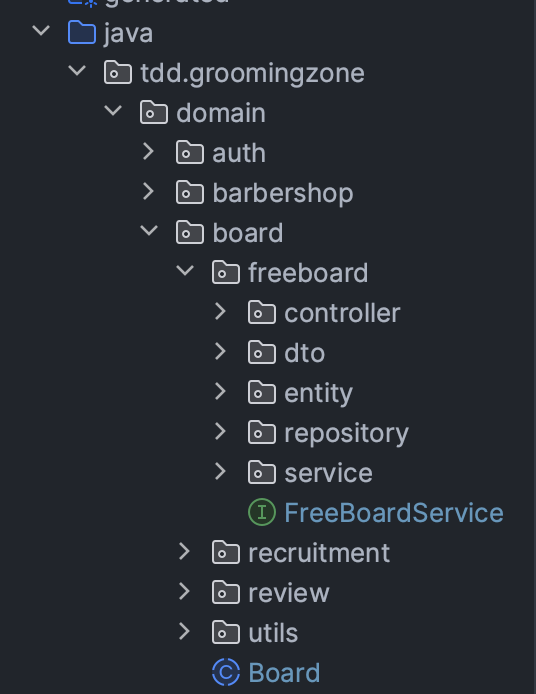 하나의 도메인 영역 내에 계층 구분이 명확하게 되어있지 않다, controller와 repository가 같은 단위에 자리하고 있다. 특정 계층에서 역할을 수행하는 객체를 찾기가 쉽지 않다, dto의 사용 위치나 entity의 사용 위치를 파악하기 어렵다.