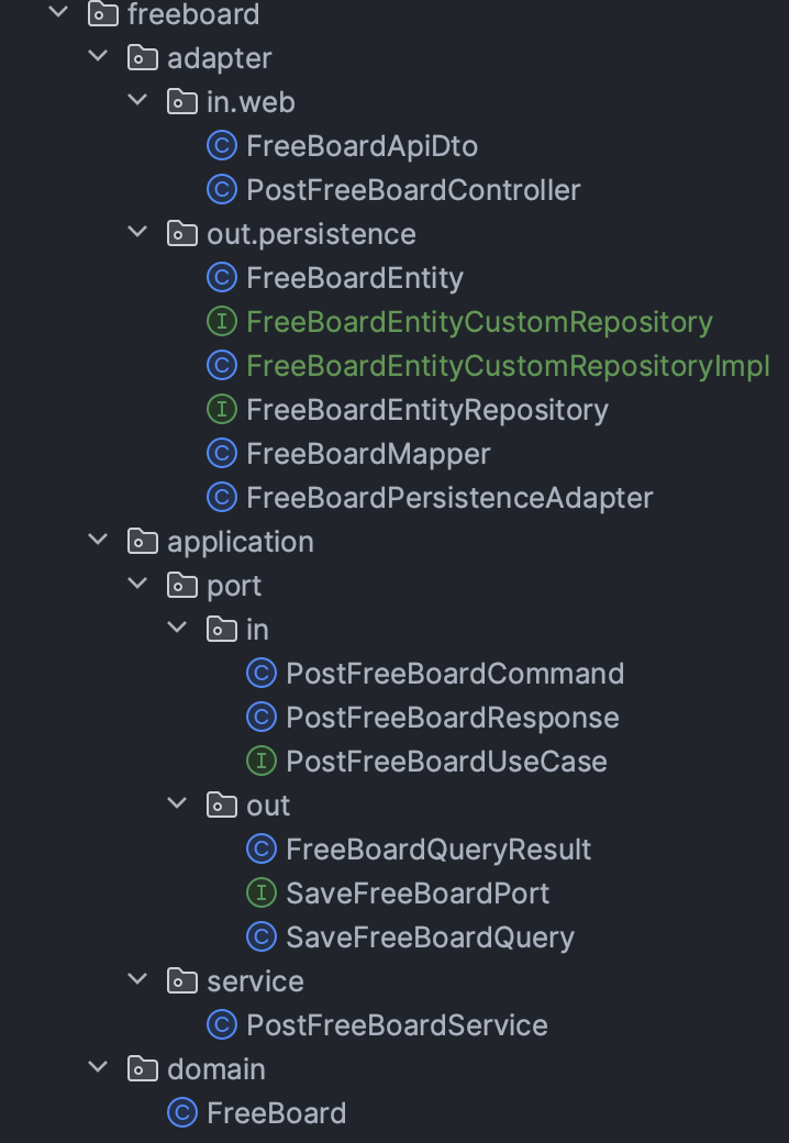 freeboard라는 도메인 영역 내에 adpater, application, domain으로 각 계층을 분리했다. Input Adapter와 Output Adapter를 분리해 각 영역에서 사용되는 객체 탐색이 쉽다. 마찬가지로 애플리케이션 계층에서도 port와 service를 분리해 의존하는 추상적 영역과 구현의 영역을 구분했다.