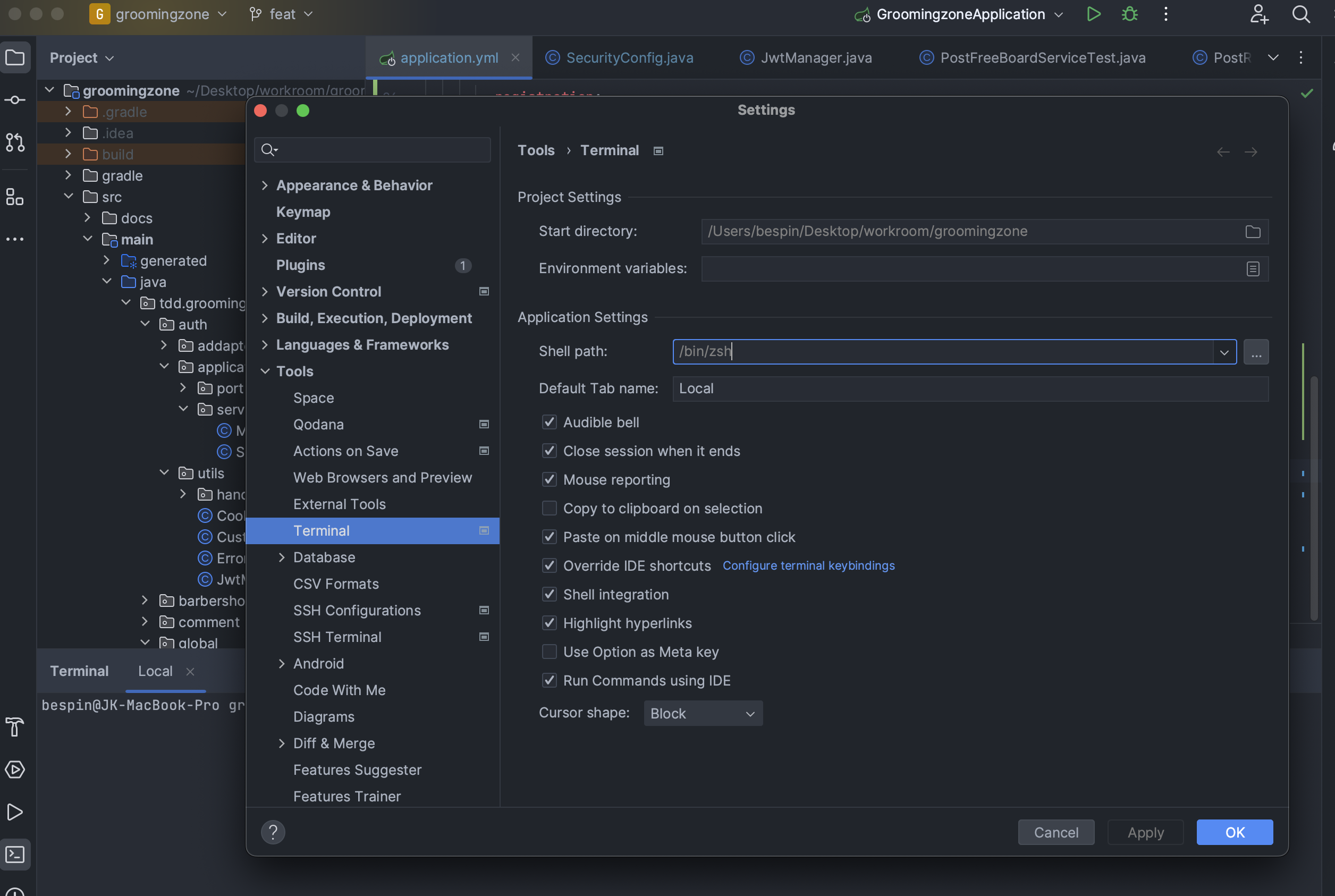 그래서 기본 shell을 zsh로 바꿨다. 바꾸는 방법은 간단하다. 시킨대로 터미널에서 chsh -s bin/zsh만 입력하면된다. 이렇게 기본 쉘을 변경한 뒤 zsh의 환경 변수 설정 파일인 zshrc를 수정하고 적용하면...! 야무지게 인텔리제이가 읽어온다.