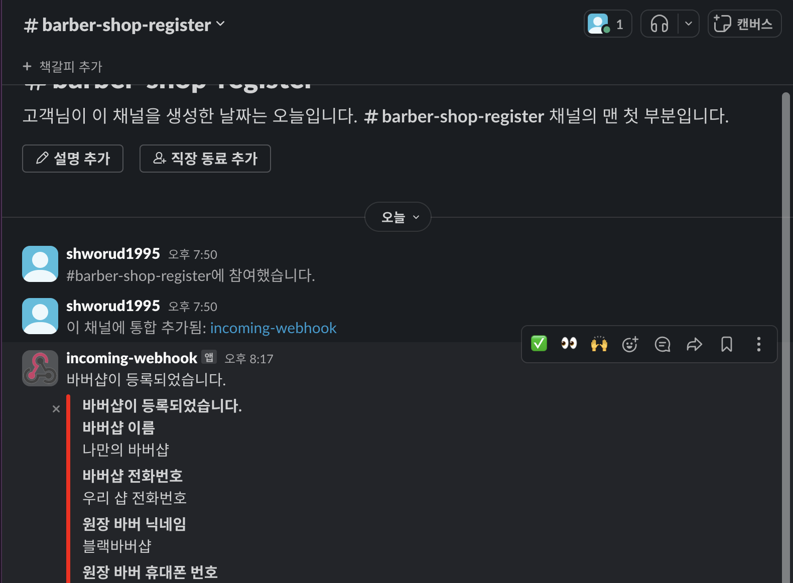 이렇게 진행하면 문제는 한 명의 바버가 너무 많은 샵을 등록할 수도 있고, 샵 자체를 장난으로 등록할 수도 있다. 따라서 서버측에서는 바버샵이 등록되었다는 정보를 알아야 할 필요가 있다. 이러한 문제를 해결하기 위해 일차원적인 해결 방안으로 서버측에 알람을 보내는 방법을 생각했다. Slack WebHook을 이용하면, 서버에서 발생한 상황을 Slack에 메세지로 전달하여 확인할 수 있다. 오늘은 바버샵을 등록하는 과정에서 Slack WebHook을 통해 서버에서 발생한 상황을 알림으로 보내는 형태의 구현을 진행했다.