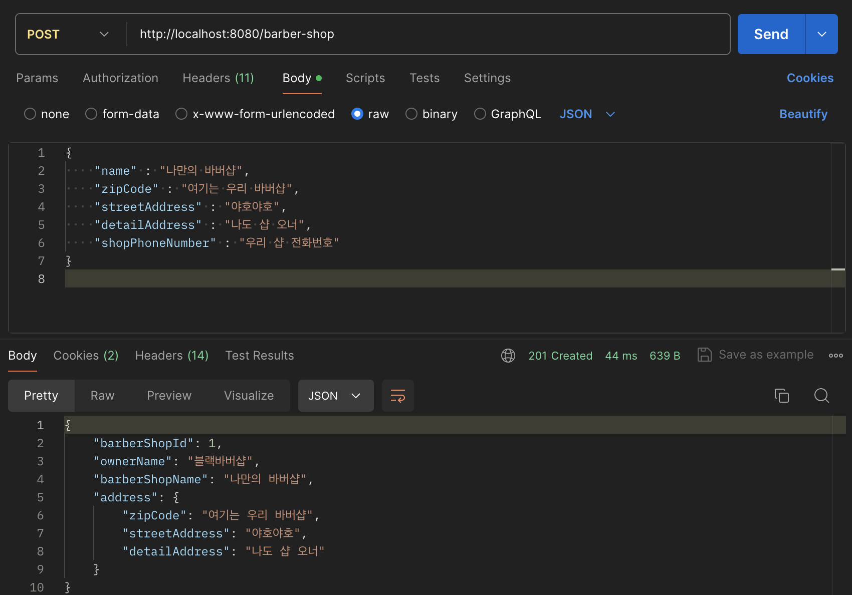 바버샵 등록 요청을 보내면 요렇게 응답이 온다. 나중에 다음 주소 API를 사용하기 위해 주소는 저렇게 설정했다.
