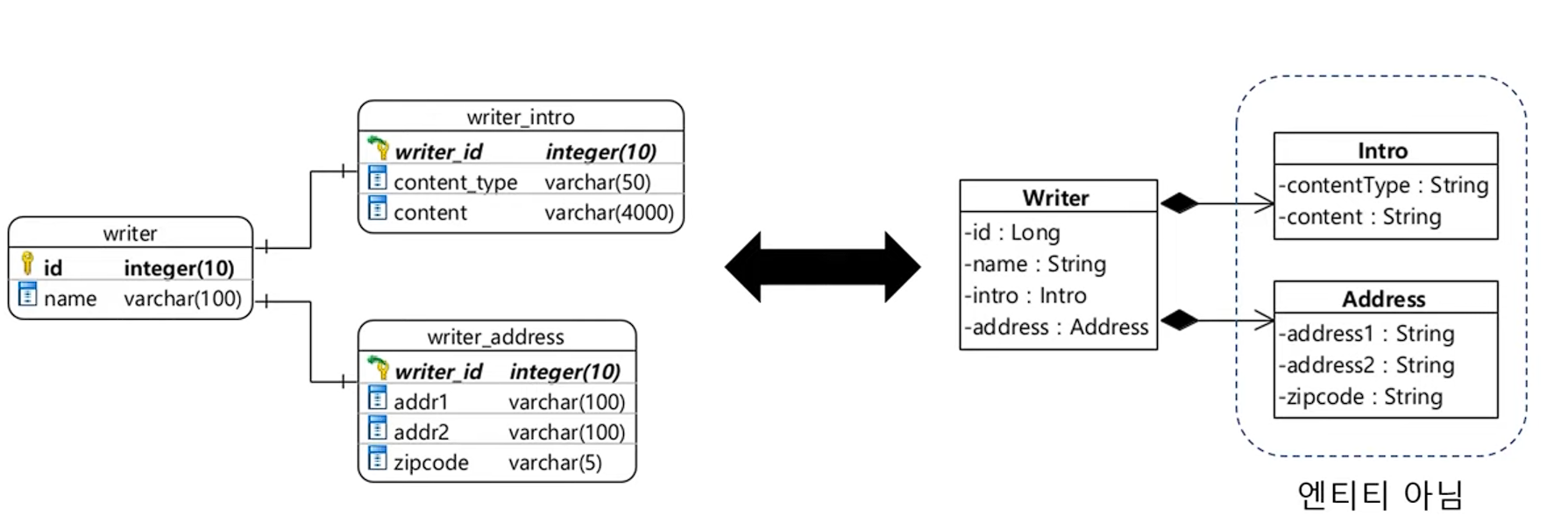 - @Embeddable로 엔티티인 Writer에 Intro와 Address를 매핑할 수 있다.