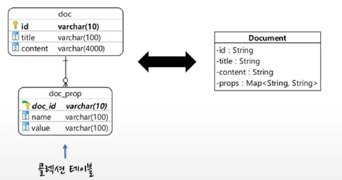 - doc_prop 테이블에는 해당 맵이 어느 객체의 것인지를 나타내기 위한 doc_id와 name, value가 저장된다.