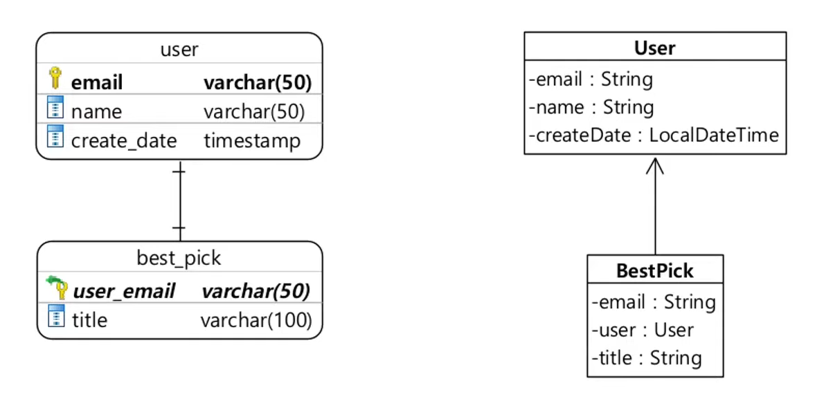 - @OneToOne과 @PrimaryKetJoinColumn(name = "user_email"(best_pick 테이블에서 user테이블을 참조할 때 사용할 칼럼)을 사용하면 된다.