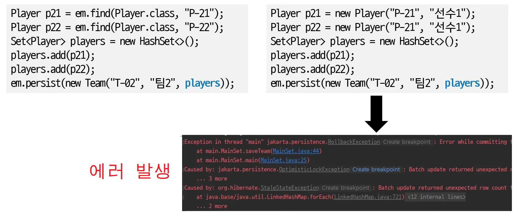 - 새로 만든 객체를 활용해서 persist()를 하면 DB에 새롭게 만든 객체의 정보가 없으니까 에러가 발생한다.