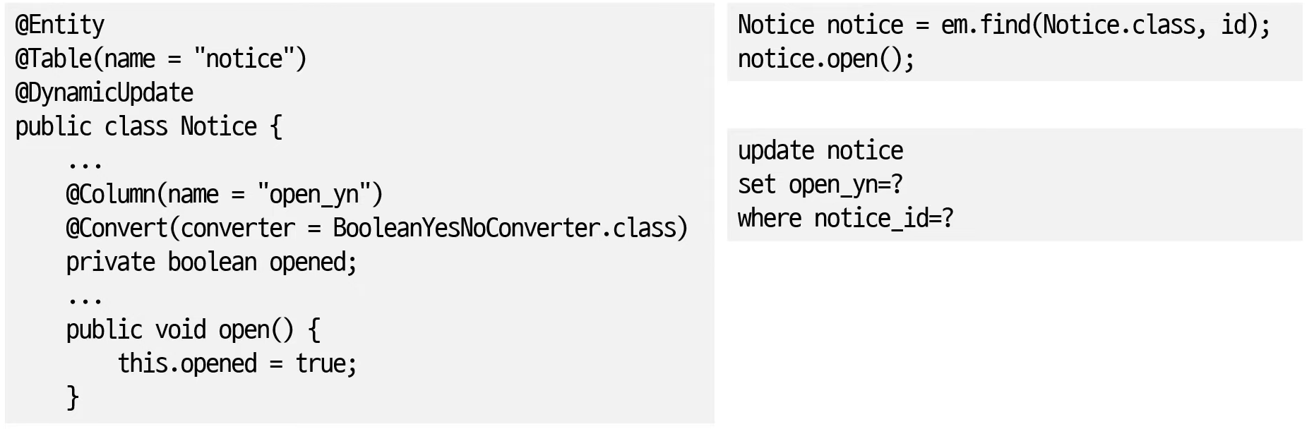 - Notice클래스에 @DynamicUpdate 애너테이션을 붙이고 Notice#open()을 사용하면 UPDATE 쿼리에 open_yn 칼럼 값만 해당된다.