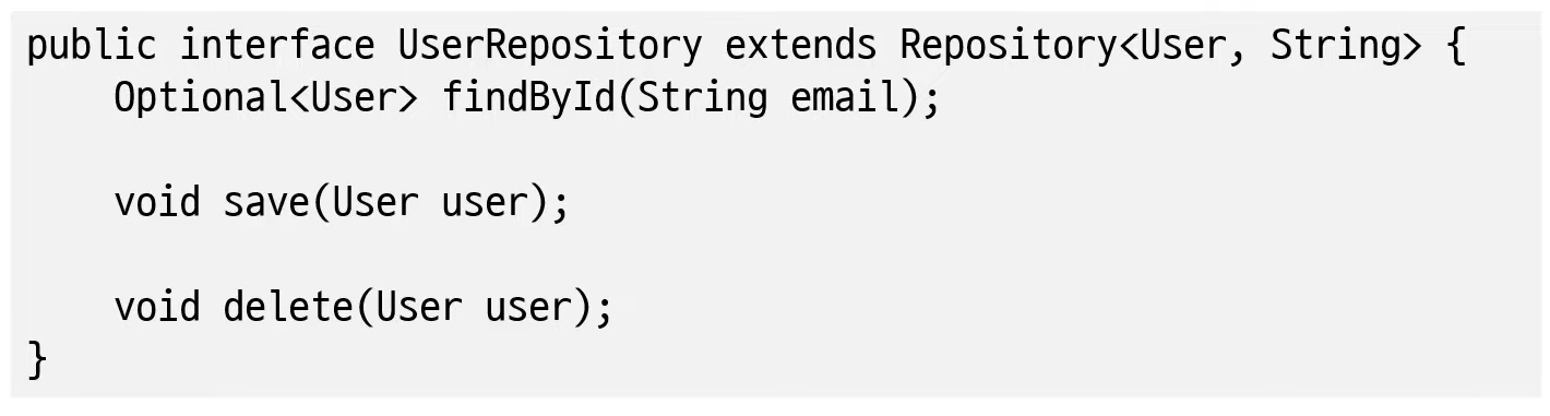 - save(), findBy**(), delete() 등 규칙에 맞게 메서드를 정의한다.