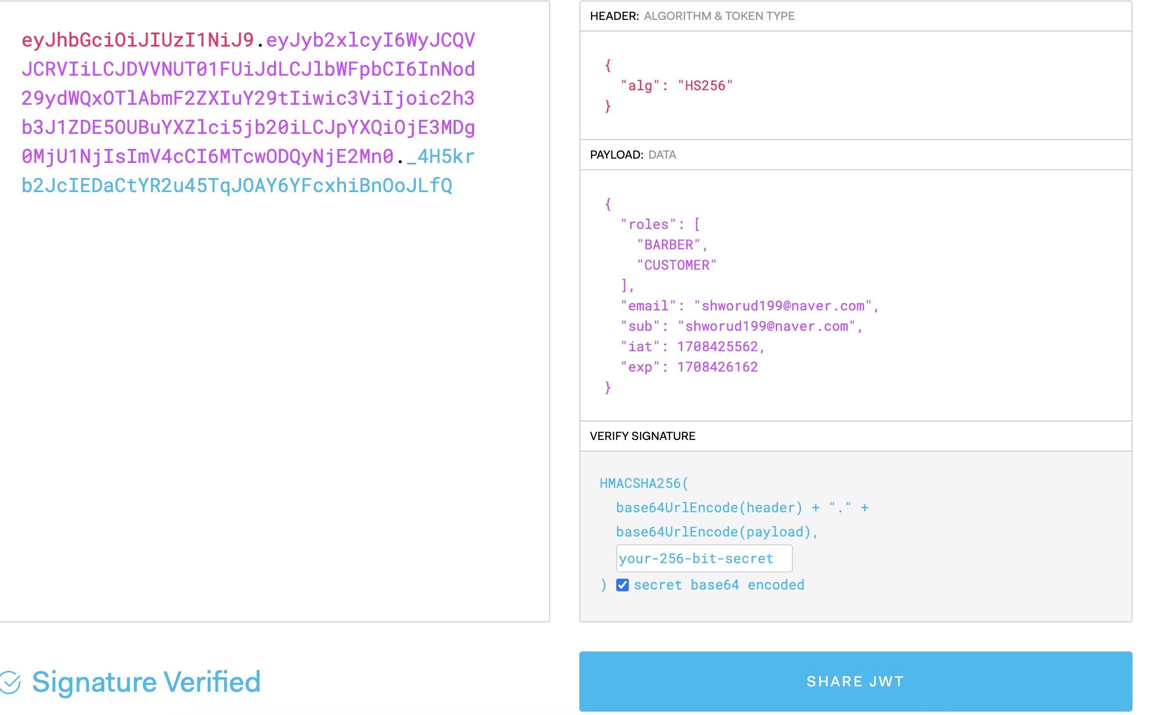 해당 토큰은 JWT타입이고, 서명을 생성하는데 적용된 알고리즘은 HMAC SHA256알고리즘이 적용되었다. 별 중요한 내용은 없다.